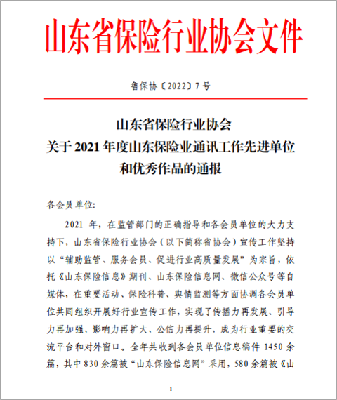 山东分公司荣获2021年度山东保险业通讯工作先进单位称号