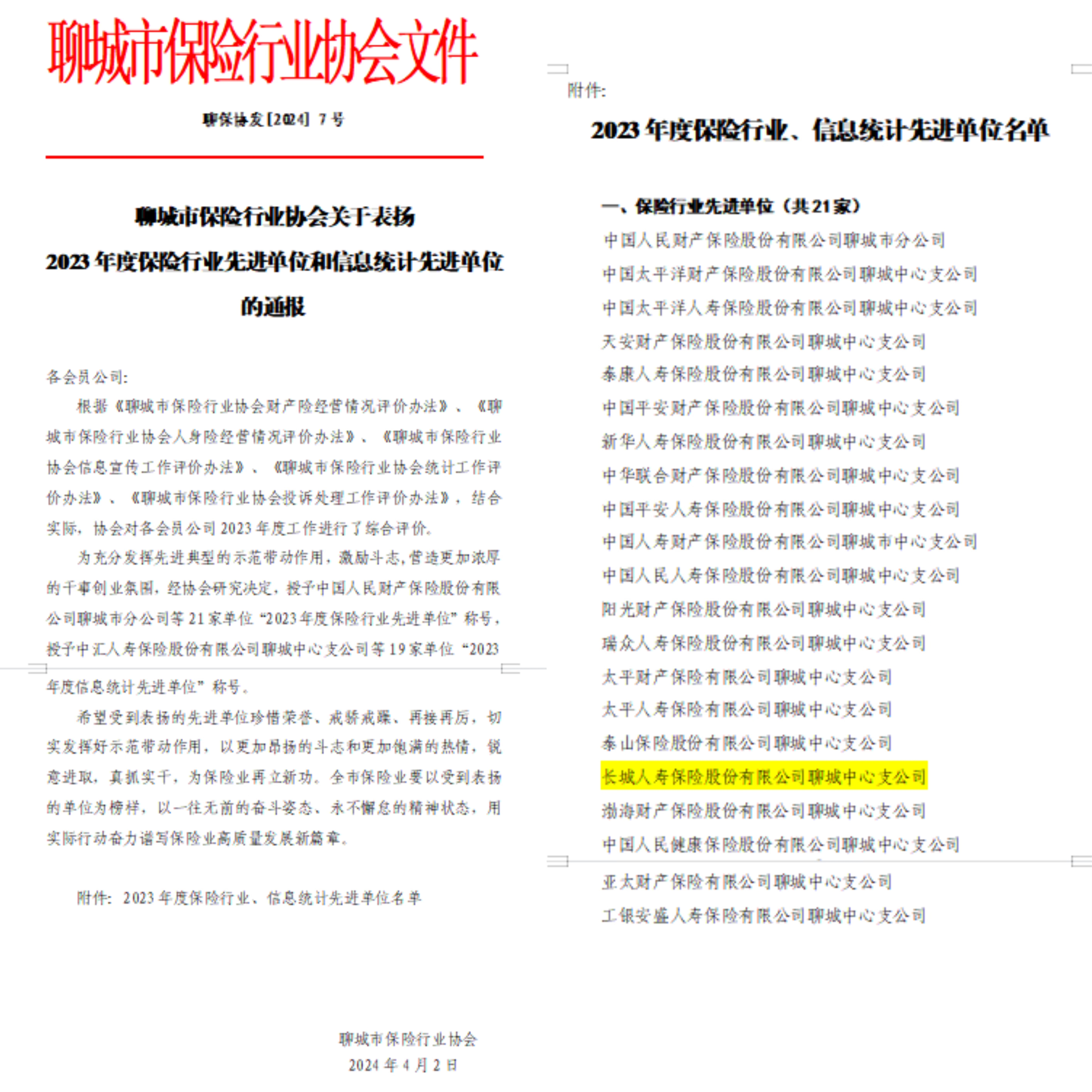 聊城中支荣获“2023年度保险行业先进单位”称号